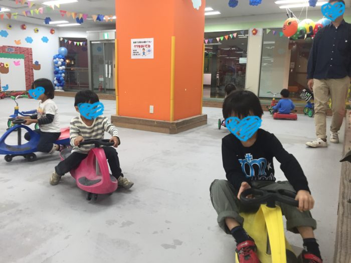 高速で車を乗り回しています。本来、ハンドルをくねくねさせて進む車なのですが、足で漕いで高速走行し、体を傾けてカーブを曲がってました。お友達とぶつかりそうになりますが、そこをかわして走るのがまた楽しいよう。