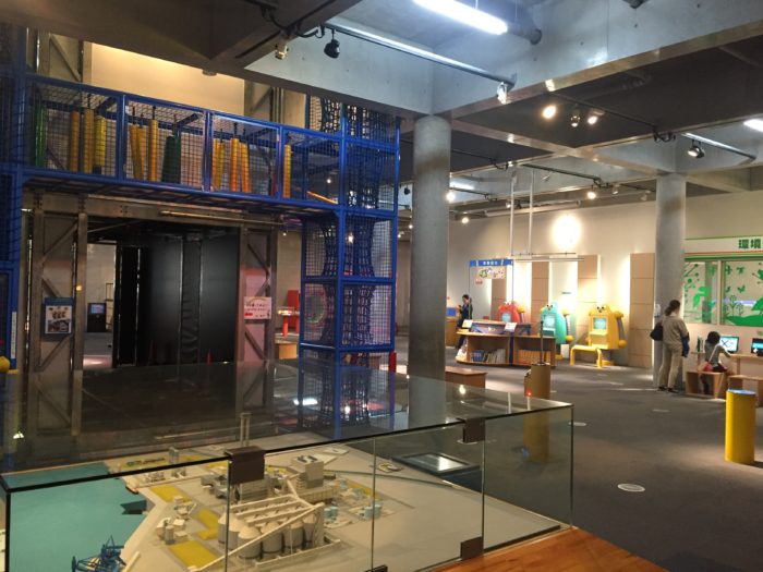 4すみがそれぞれのテーマにわかれていて、模型や触って学べる装置が置いてあります。