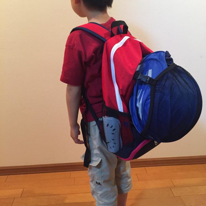他のお友達を見ると、ボールをリュックの外にネットでとめるタイプのリュックを使っています。