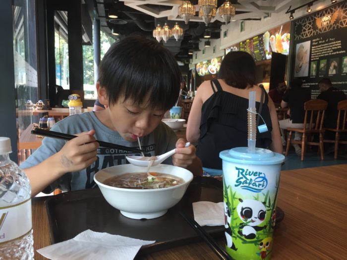 さんざん遊んだ後、入口近くの「Hawk cafe」でラーメンを食べる長男。ジュースの容器は、なぜかリバーサファリでした。