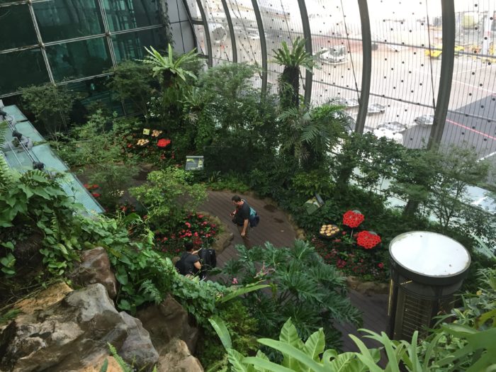 チャンギ空港第3ターミナル内の鯉が泳ぐ池の奥にあり、無料で楽しむことができます。