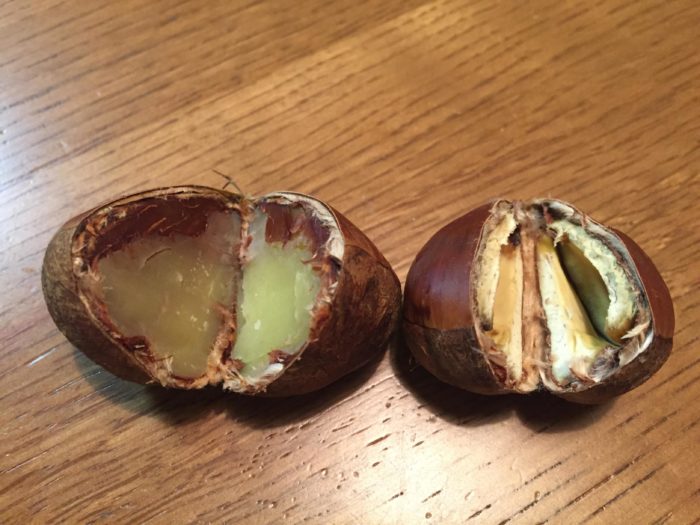 左が、何とか乾燥せず熟成できた栗、右が凍って乾燥してしまった栗です。