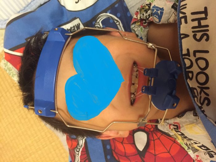 「急速拡大装置」を装着して2ヶ月後、上顎が広がってきたのが確認されたら、次は「上顎前方牽引装置(MPA)」というものを使うことになりました。