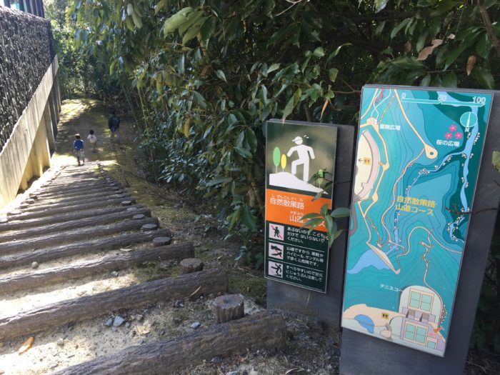 テニスコートの西から、自然散策路が始まっていたので、そこを通って冒険広場に向かうことにしました。