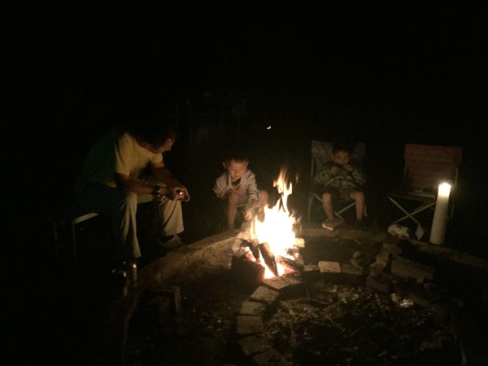 キャンプ場に帰ったら、焚き火を囲んでのパーティ開始です。