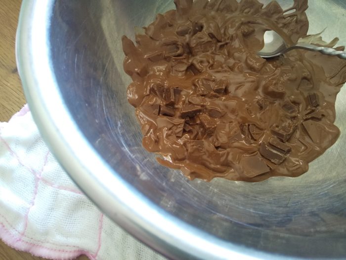 耐熱ボウルに沸騰したお湯を入れて、少々冷まし、細かくしたチョコの入ったボウル浸けて数分待つと、チョコレートが溶けはじめます。